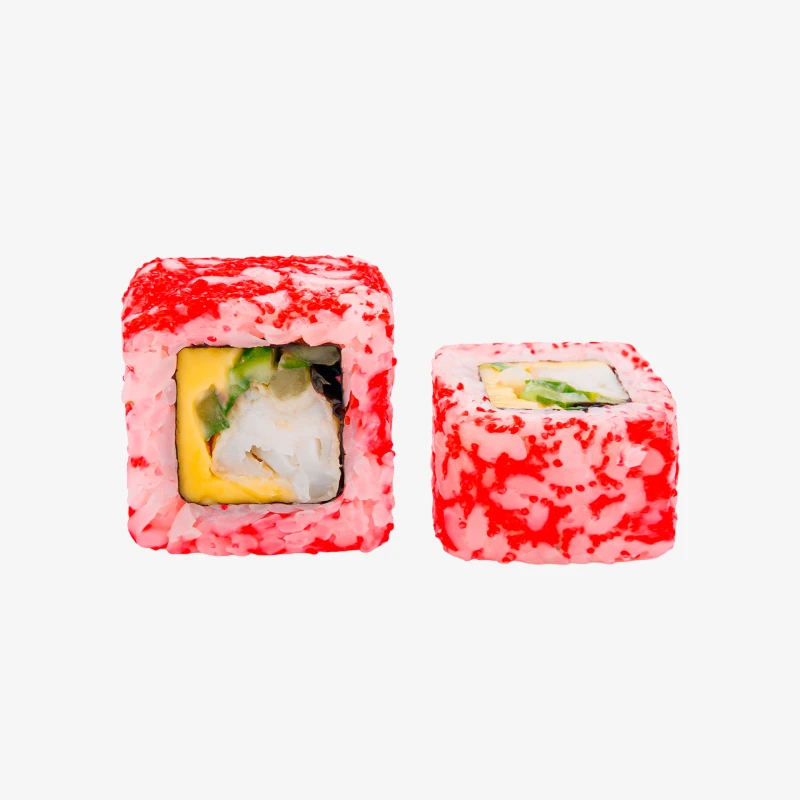 Состав: рис, икра масаго красная, окунь жареный, огурцы, сыр плавленый в ломтиках, нори. Выход: 194 гр. Годен 3 часа при t 20°C; 12 часов при t 4±2°C.