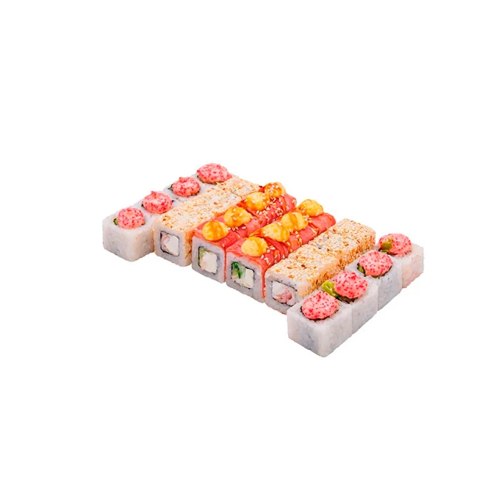 619 грамм, 3 вида, 24 кусочка Роллы: Уно, Лава с курицей Запеченные: Бекон Хот. Годен 3 часа при t 20°C; 12 часов при t 4±2°C.