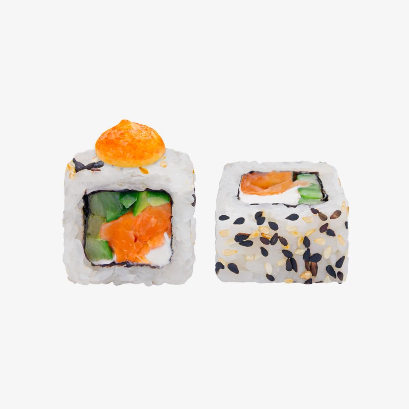 Состав: рис, сыр Cremette, лосось слабосоленый, огурцы, соус спайс, кунжут, нори. Выход: 203 гр. Годен 3 часа при t 20°C; 12 часов при t 4±2°C.